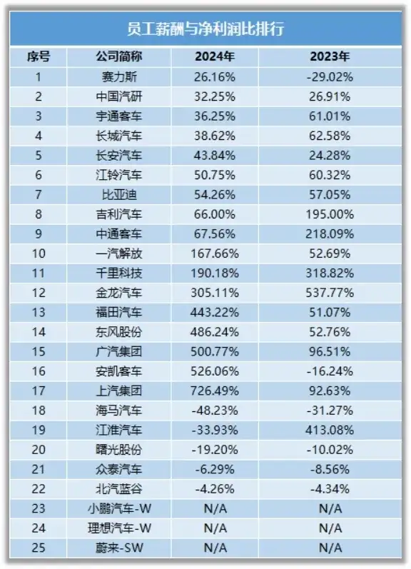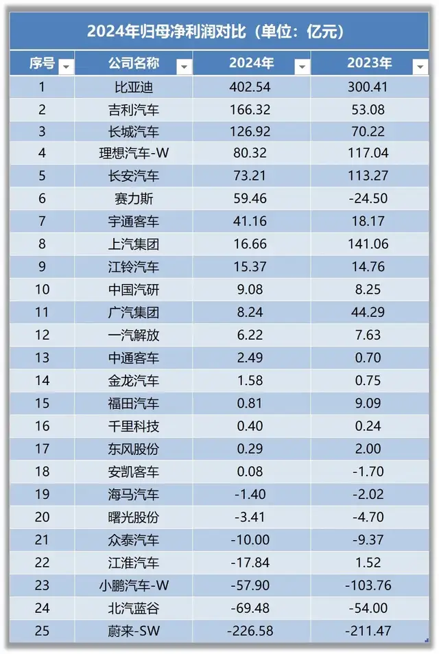 本文基于Wind数据平台提供的2023年及2024年汽车制造行业上市公司财务数据,对25家企业的薪酬结构与盈利能力进行横向对比分析。下表是过去两年整车制造公司的利润情况。