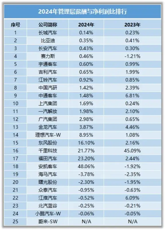 比亚迪(002594.SZ)与长城汽车(601633.SH),规模化压低管理层占比。比亚迪的管理层薪酬仅占员工薪酬的0.64%(1.40亿元/218.43亿元),体现“以员工为核心”的制造业逻辑;长城汽车这一数字表现更低,占比为0.37%(0.18亿元/49.02亿元),净利润增长80.7%,证明低薪酬比与高效益可共存,同时也意味着长城汽车改善员工待遇的空间不小,如果能获得投资者支持,在当下市场环境牺牲部分利润以换取公司士气提升也不失为好选择。