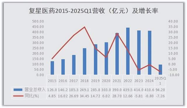 过了峰值第三个年头,颓势甚至有扩大趋势。2025年第一季度,这家全球化医药健康产业集团的营业收入为94.20亿元,同比下降7.26%。