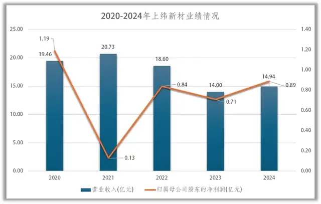 从业绩上看,2020年上市当年上纬新材营业收入为19.46亿元,归母净利润为1.13亿元;随后近年来,上纬新材的表现始终未能超过上市当年。2021-2024年,上纬新材营业收入分别为20.73亿元、18.6亿元、14亿元、14.94亿元;归母净利润分别为0.13亿元、0.84亿元、0.71亿元、0.89亿元。