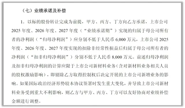 根据双方的收购协议,上纬新材的现任控股股东承诺,2025年-2027年,公司归母净利润应分别不低于6000万元,扣非归母净利润分别不低于8000万元。