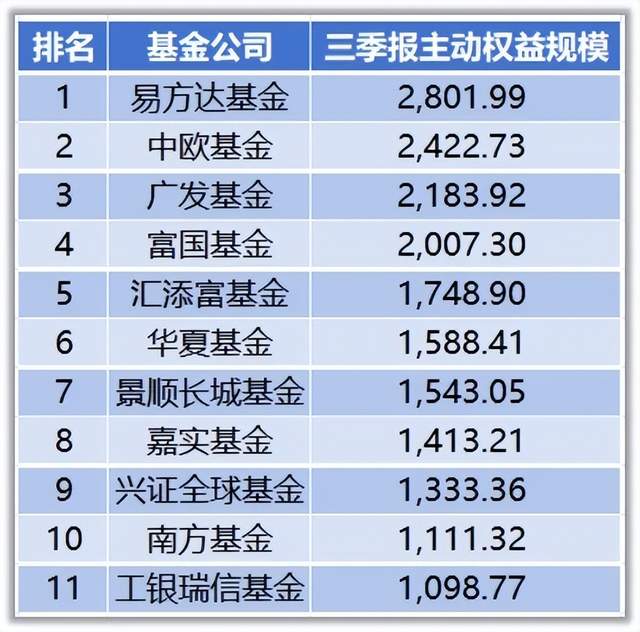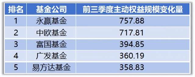 从规模增长量来看,永赢基金和中欧基金的主动权益规模表现尤为抢眼。根据Wind数据统计,永赢基金和中欧基金前三季度主动权益规模增长量均超700亿元,富国基金、广发基金、易方达基金的规模增长量均超350亿元,位列行业前五。