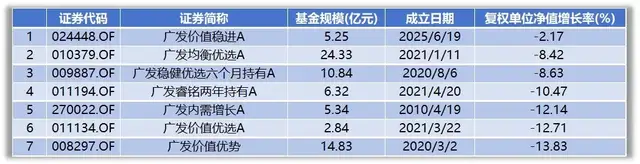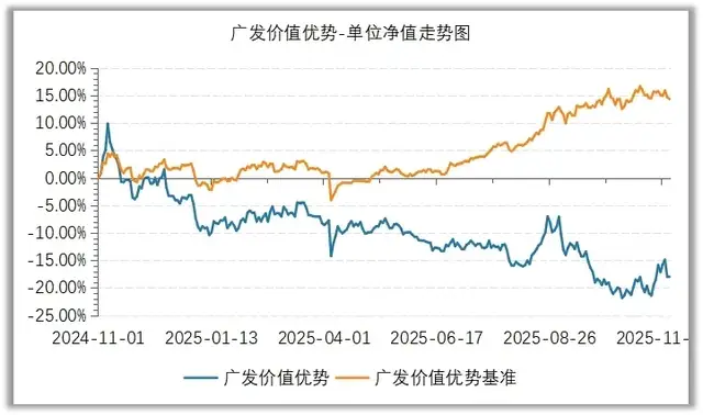 从绝对收益来看,广发基金旗下有9只主动权益产品今年以来收益率为负值。其中,表现最差的产品广发价值优势(008297.OF),年内收益率达到-13.83%,近一年跑输业绩比较基准近30个百分点,在全市场主动权益基金中排名倒数。