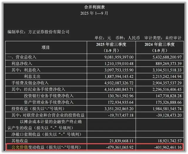 财报显示,今年前三季度公司公允价值变动收益却亏损4.79亿元,亏损额较去年同期扩大19.25%。这反映出公司所持股票、债券等交易性金融资产浮亏增加。