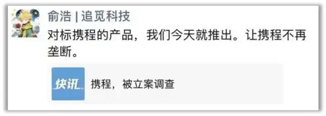 这种担忧并非不切实际,去年京东以三年0佣金策略强势切入酒旅市场,短短几天内就有5万家酒店提交入驻申请。而且在携程被立案之后,美团、抖音对这块肥肉自然更加跃跃欲试。除此之外,追觅科技创始人兼CEO俞浩发文称“对标携程产品今天推出”,当然这个看一看就行。
