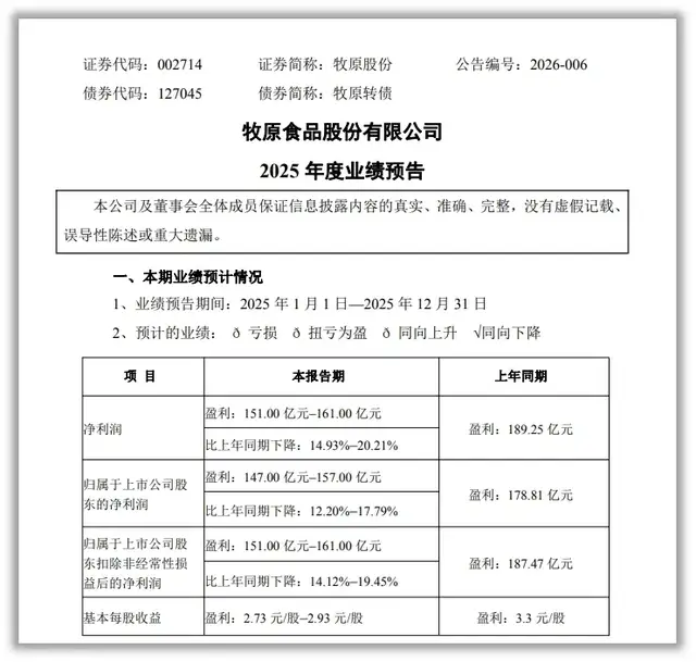1月15日,牧原股份发布了2025年度业绩预告。报告中预估,2025年归母净利润约为147亿元-157亿元区间,较上年同期下降12.20%至17.79%。
