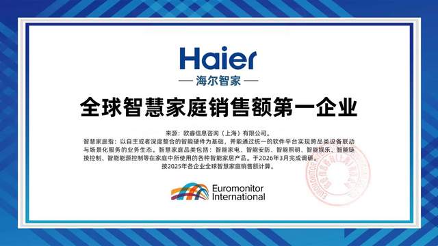 欧睿国际最新数据显示:继家电全球17连冠后,海尔智家又成为全球智慧家庭销售额第一企业。截至2025年底,海尔智慧家庭全球累计注册用户突破1.3亿,全年智慧场景交互总量达861亿次,月均交互71.75亿次。在国内及一带一路沿线国家,Hai Smart生态平台拥有1300多万活跃用户、6600多家生态合作方、5500多万台联网设备;在美洲、欧洲、澳洲地区,SmartHQ平台汇聚460多万活跃用户、6500多家生态合作方、2100多万台联网产品。