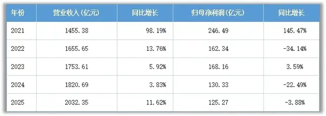 2021年,公司净利润达到246.49亿元的历史峰值,毛利率26.26%,此后便进入下行通道。尽管营收持续增长,净利润却连续两年下滑,今年虽降幅收窄,但“增收不增利”的格局仍在延续。
