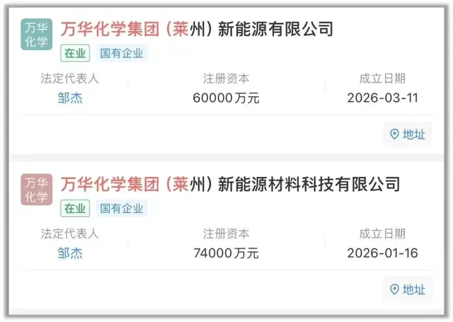 近期,根据企查查数据显示,万华化学2026年在莱州新注册了两家子公司,此次新公司的成立,是万华化学在莱州新能源布局的最新一步,电池材料是万华化学明确定位的“第二增长曲线”。