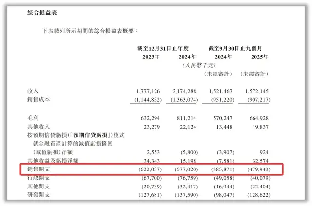 事实上,为了维持行业第四的排名,德兰明海事实上不得不维持着高昂到令人咋舌的销售及营销开支,以烧钱换增长。2023年至20259月,德兰明海的销售开支分别为6.22亿元、5.77亿元、4.8亿元。2025年前九个月,公司的销售开支已经占到同期收入的30.5%。