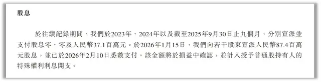 招股书显示,2025年前三季度,德兰明海宣派并支付了上一年度的股息3710万元。紧接着在2026年1月15日,距离向港交所递表仅一个月,再次向若干股东宣派8740万元股息,并于2月10日悉数支付,两次分红合计高达1.25亿元。