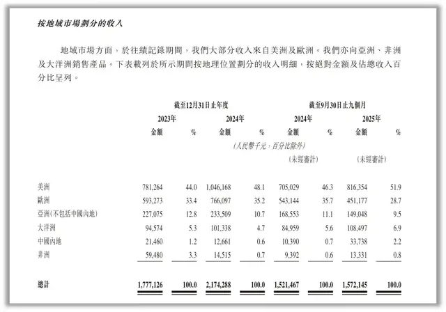 同时,德兰明海的生存异常脆弱。根据招股书,德兰明海超过97%的收入来自于海外,2025年前9个月,德兰明海在中国内地的收入占比仅有2.2%,而美洲占比达到了51.9%、欧洲占比达到了28.7%。在2026年,全球地缘政治愈发紧张的当下,任何一点风吹草动都有可能摧毁德兰明海多年来的努力。
