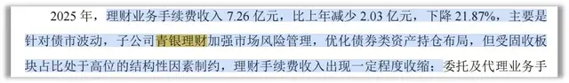其中,子公司青银理财受债市波动冲击,理财业务手续费收入从9.29亿元骤降至7.26亿元,跌幅达21.87%。