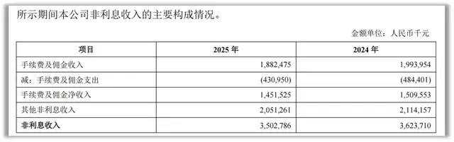 2025年该行非利息收入35.03亿元,同比下降3.34%。