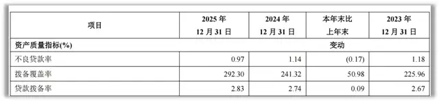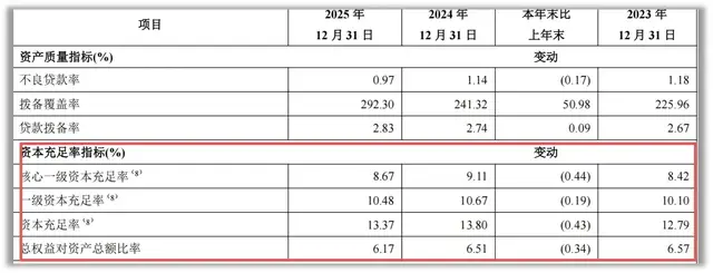 财报显示,2025年末,核心一级资本充足率8.67%,较上年末下降0.44个百分点;一级资本充足率10.48%,下降0.19个百分点;资本充足率13.37%,下降0.43个百分点。