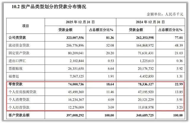 据青岛银行披露,2025年末零售贷款740.01亿元,同比下降5.53%,占贷款总额比重从22.99%降至18.64%。其中,个人消费贷款162.34亿元,同比骤降19.32%;个人住房按揭贷款454.90亿元,下降3.61%。