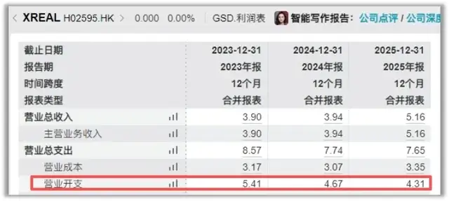 2023年至2025年,XREAL的研发开支分别为2.16亿元、2.04亿元和1.83亿元,连续两年下滑。研发开支占总营收的比例,从2023年的55.3%骤降至2025年的35.5%。
