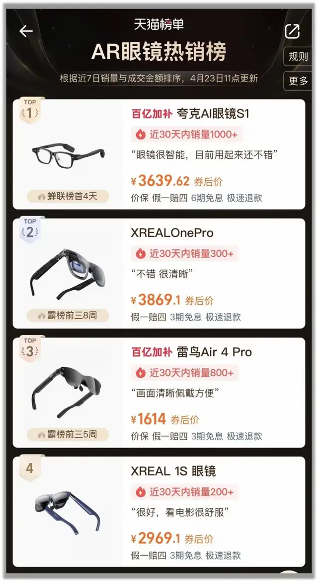 在中国线上市场,根据洛图科技的数据,XREAL的销量份额从2024年的25%下滑至2025年的20%,而雷鸟创新以35.4%的份额稳居第一。包括阿里巴巴2025年10月推出首款自研的夸克AI眼镜目前在天猫热销榜上榜TO1。