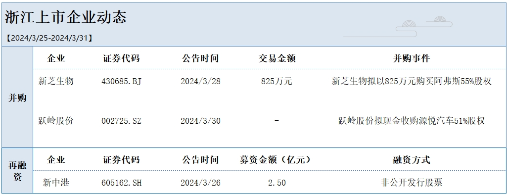 3月25日-3月31日,全国无企业向发审委提交首发申请;2家浙江公司发布并购重组公告,1家浙江公司发布再融资公告。