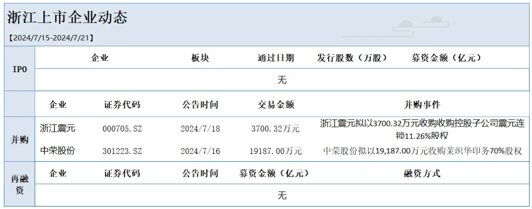上周,全国无企业向发审委提交首发申请,2家浙江公司发布并购重组公告,无浙江公司发布再融资公告。