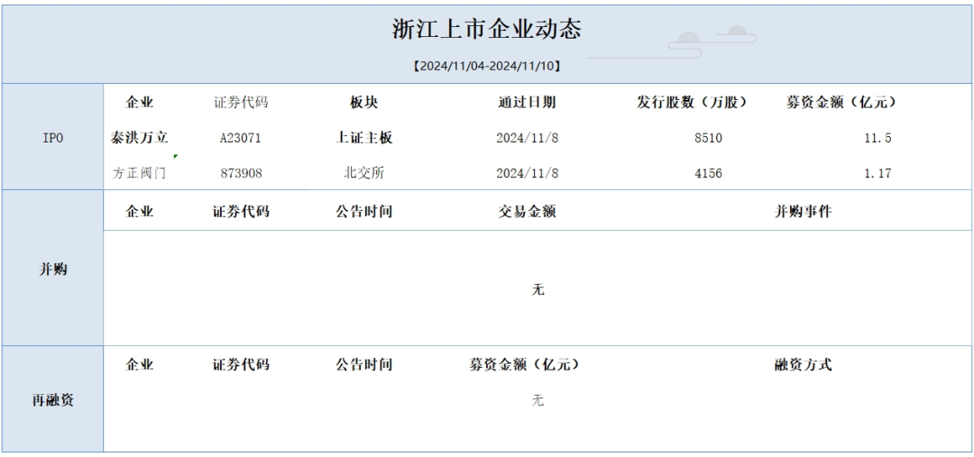 上周,全国3企业向发审委提交首发申请,3家过会,其中2家浙江省内企业,0家浙江公司发布并购重组公告,0家浙江公司发布再融资公告。