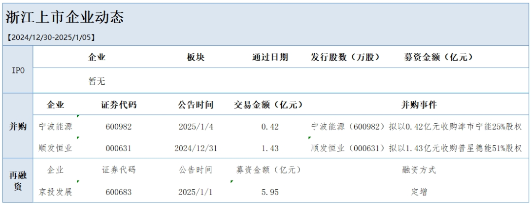 上周,全国0家企业向发审委提交首发申请,0家过会,其中0家浙江省内企业,2家浙江公司发布并购重组公告,1家浙江公司发布再融资公告。