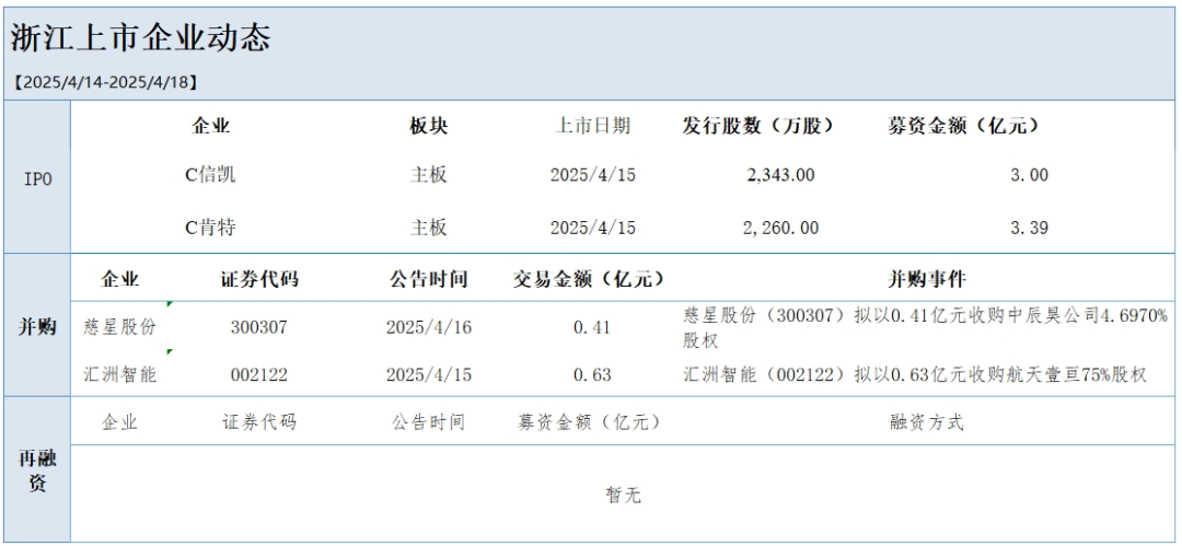 上周,全国4家企业向发审委提交首发申请,2家过会,其中0家浙江省内企业,2家浙江公司发布并购重组公告,0家浙江公司发布再融资公告。4月15日,C信凯(001335)登陆主板,4月16日,C肯特(603120)登陆主板。
