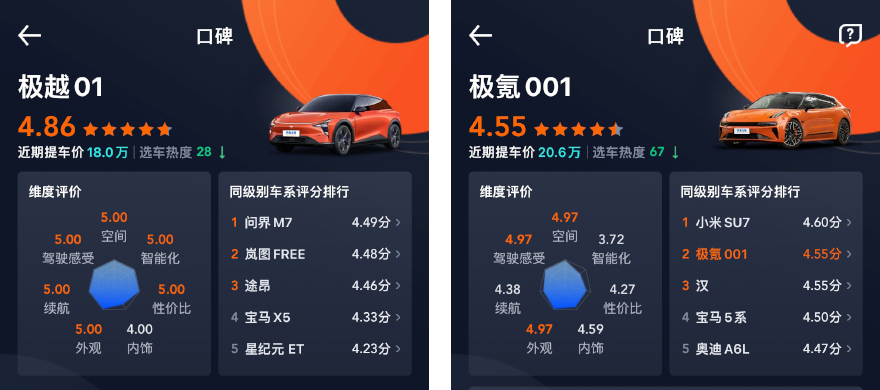 在《汽车之家》的榜单中,极越01的口碑分数高达 4.86 分,力压全场,甚至远远超过特斯拉 Model Y 的 4.33 分。跟极越01同一条生产线的极氪001,得分为 4.55 分,两者在空间、驾驶感、续航、外观、内饰、性价比等维度相差无几,最大的差距就是智能化。智能化维度,极氪001得分 3.72,极越01得分满分5分。
