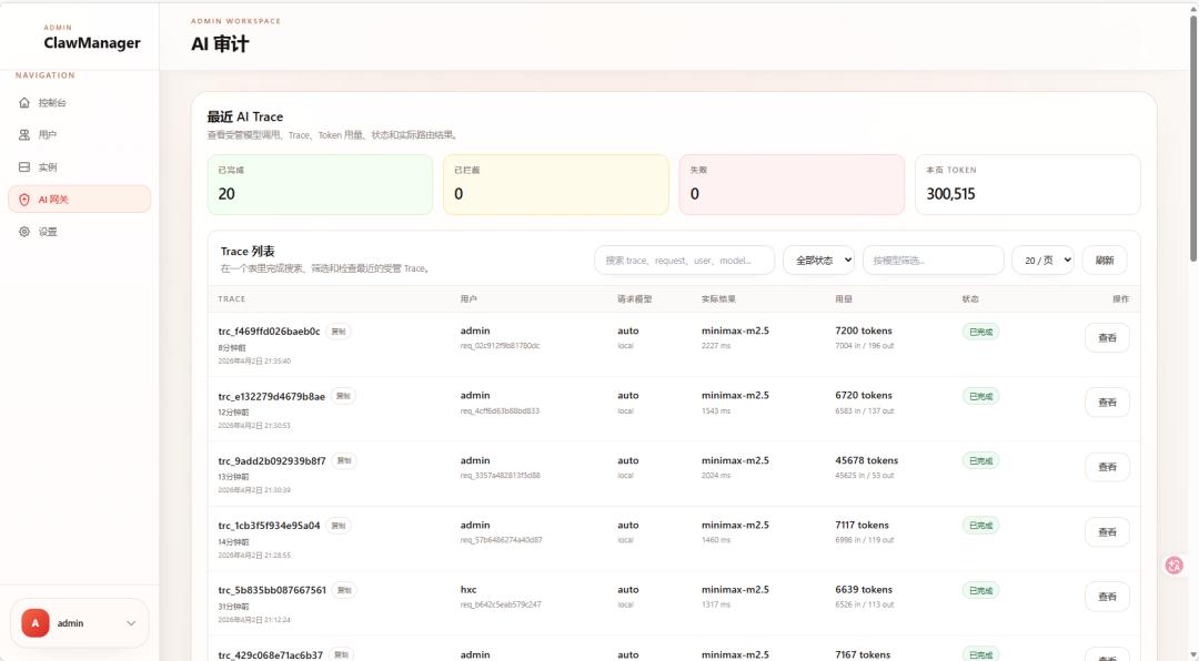 以企千虾集成的ClawManager来看,特别是对于预算有限的中型企业而言,企业需要的是更具确定性的成本管控,比如穿透查看任务执行细节,包括审计事件、实时Token用量及预估费用等,以及从汇总视角俯瞰全局投入,系统自动统计输入/输出Token总量、预估外部单价费用及内部模型核算成本等。