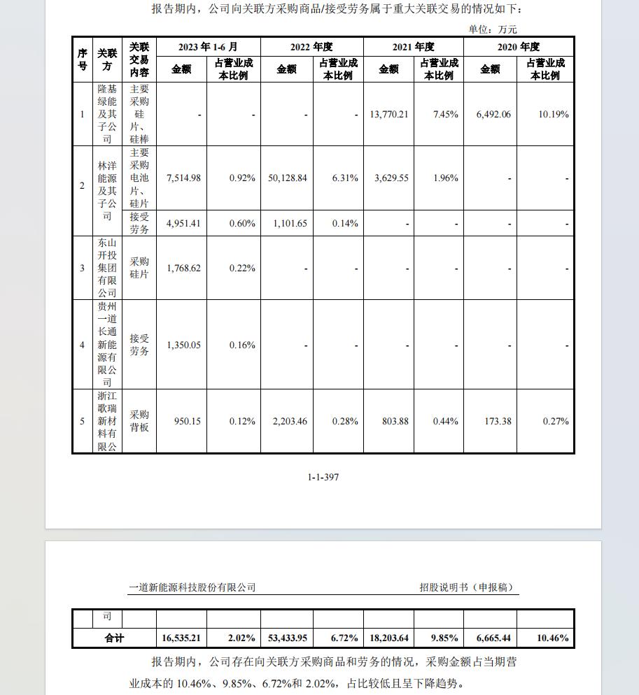 而另一个关联方客户是林洋能源及其子公司,一道新能2021年向其销售额为1.003亿元,占比5.30%;2022年为1850万元,占比0.22%;2023年上半年为1.27亿元,占比1.34%。林洋能源子公司林洋投资于2022年1月入股一道新能,目前持股1533.58万股,持股比例为3.3405%,