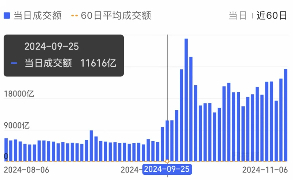 目前,市场活跃度与流动性显著提升,未来市场机遇众多。截至2024年11月6日,A股市场成交额连续26个交易日突破1万亿元,超过了2023年4月3日-5月10日的连续24个交易日(数据来源:同花顺财经),成功创下了2015年 7月中旬以来的新记录。