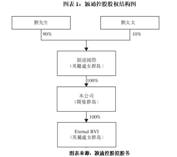 颖通控股成立于1983年,最初由刘钜荣在中国香港注册成立,主要经营进口香水的分销业务。目前公司的控股股东为现年78岁的刘钜荣及其妻子陈慧珍,持有公司100%的股权。而他们的女儿刘颖贤已经在公司担任执行董事,在颖通控股摸爬滚打了20年,负责整体业务发展,但儿子刘颖恒并未参与公司经营,而是专注于自己的眼镜零售业务。
