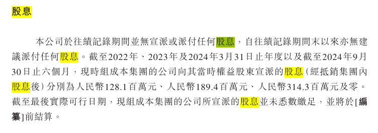 而颖通控股内部问题也不少,在IPO递表前,颖通控股曾累计派发股息近6.32亿元。近三个财年,公司分别宣派股息1.28亿元、1.89亿元及3.14亿元,超出同期净利润总和0.81亿元。尤其是2024财年,现金分红比例高达152%,存在明显的IPO前突击分红嫌疑。