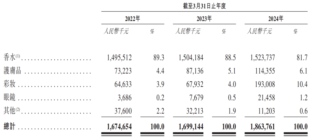 近几年,颖通控股推动产品多元化,降低香水业务占比。2022财年至2024财年,香水品类的销售占比从89.3%降至81.7%,护肤品及彩妆品类的收入年复合增长率接近50%。