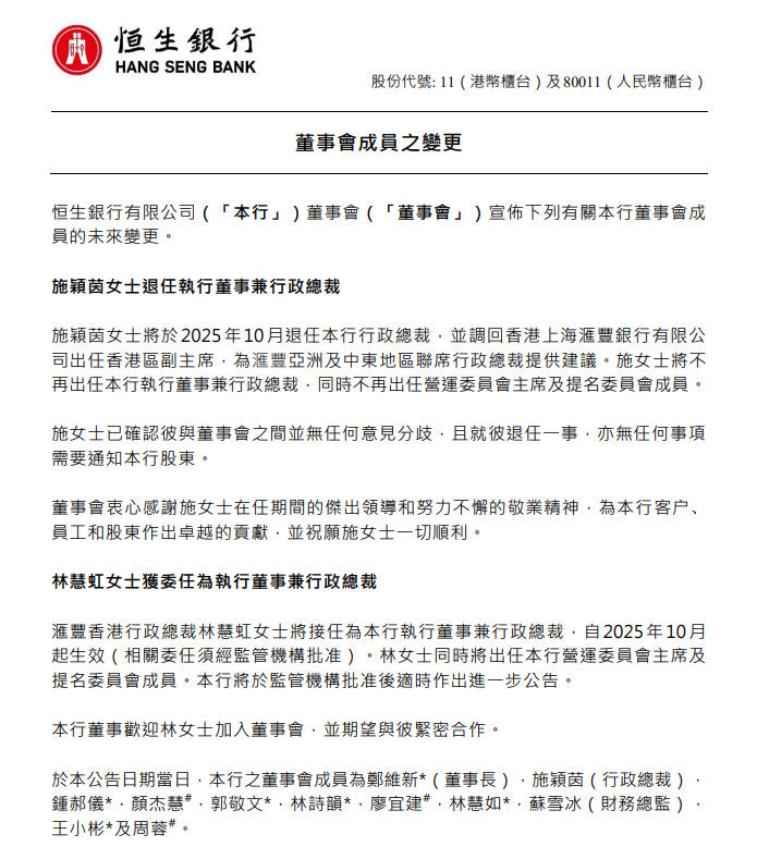 此外,汇丰香港行政总裁林慧虹将接任为恒生银行执行董事兼行政总裁,同时将出任营运委员会主席及提名委员会成员,自10月起生效(相关委任须经监管机构批准),将于监管机构批准后适时作出进一步公告。