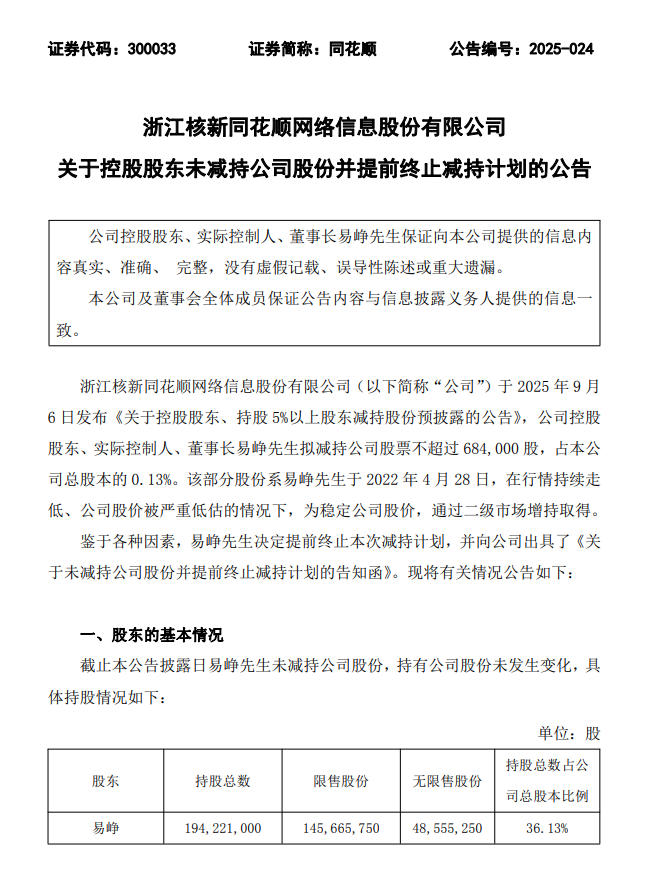 时隔一个工作日 同花顺董事长易峥终止减持计划