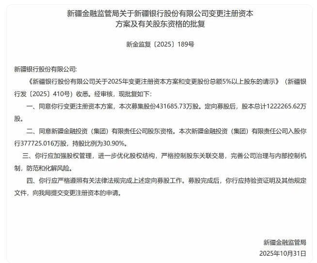 11月4日,新疆金融监管局发布《关于新疆银行股份有限公司(下称“新疆银行”)变更注册资本方案及有关股东资格的批复》,同意该行变更注册资本方案,本次募集股份431685.73万股。定向募股后,新疆银行股本总计1222265.62万股;同意新疆金融投资(集团)有限责任公司股东资格,本次新疆金融投资(集团)有限责任公司入股新疆银行377725.016万股,持股比例为30.90%。