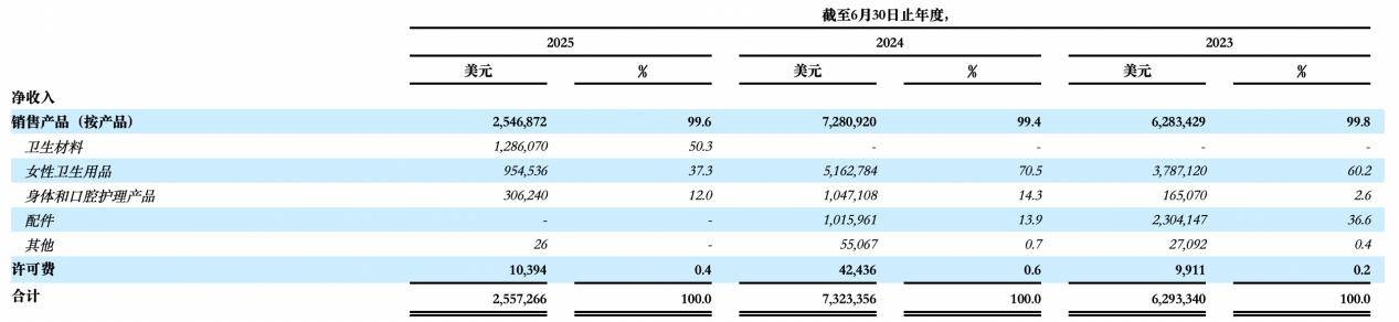 具体从业务上看,大树云曾引以为傲的卫生巾产品。2025财年,大树云的卫生巾业务收入规模仅为95.45万美元,较上一财年的516.28万美元缩水幅度高达81.51%。