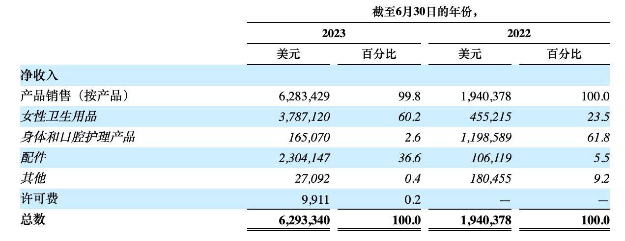 根据大树云历年财报,2022财年大树云女性卫生用品的销售收入占比为23.5%,到了2023财年,该比例提升至60%,卫生巾产品成为大树云核心收入来源。