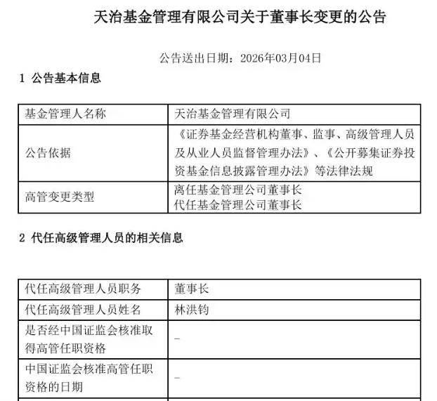 3月3日,天治基金管理有限公司(下称“天治基金”)发布公告称,董事长柴晓秀因个人原因于3月3日离任。同日,林洪钧代任董事长。上述变更事项,已经天治基金董事会审议通过,将按规定履行相应的备案手续。