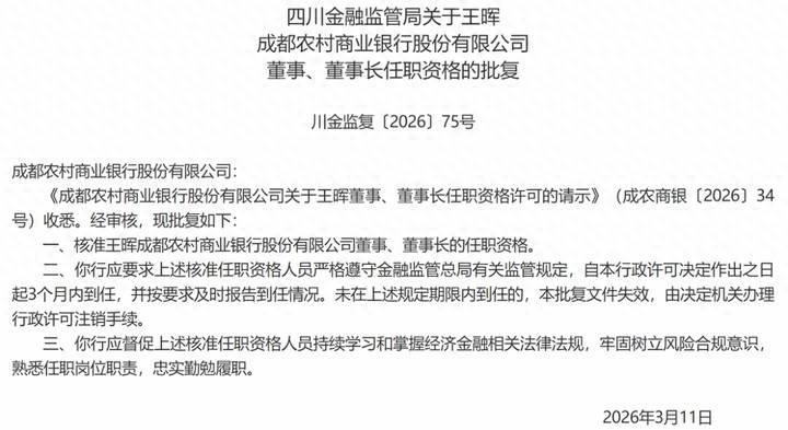 3月12日,四川金融监管局发布《关于王晖成都农村商业银行股份有限公司董事、董事长任职资格的批复》,核准王晖成都农村商业银行股份有限公司(下称“成都农商行”)董事、董事长的任职资格。