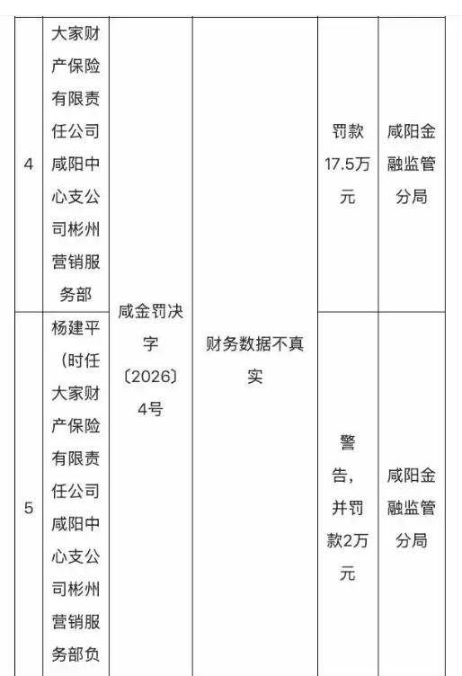3月17日,国家金融监督管理总局咸阳监管分局发布的行政处罚信息显示,大家财产保险有限责任公司(下称“大家财险”)咸阳中心支公司彬州营销服务部因财务数据不真实,被罚款17.5万元。时任彬州营销服务部负责人杨建平被警告,并罚款2万元。