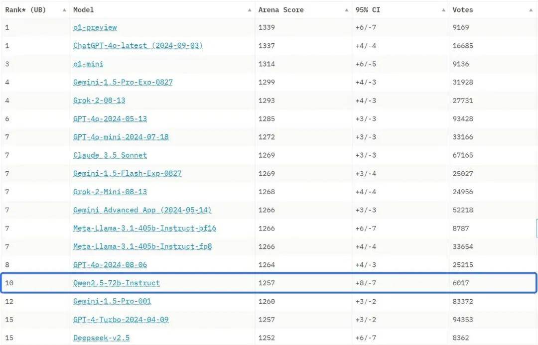 Qwen2.5-72B-Instruct排名Chatbot Arena大语言模型榜单第十