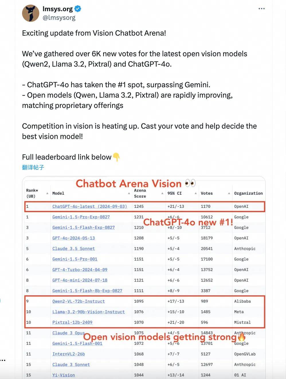 Chatbot Arena官方发文,Qwen2-VL-72B-Instruct是排名最高的开源视觉语言模型