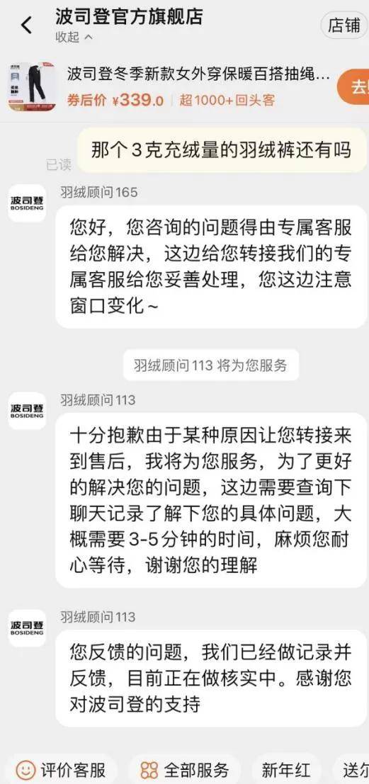 12月25日,鳌头财经向波司登官方旗舰店询问3克充绒量的羽绒裤还有没有销售,客服回复“将由专属客服妥善处理”,随后第二个客服回复:“您反馈的问题,我们已经做记录并反馈,目前正在核实中。”一个简单的问题,波司登客服现在已经不敢正面回复了。