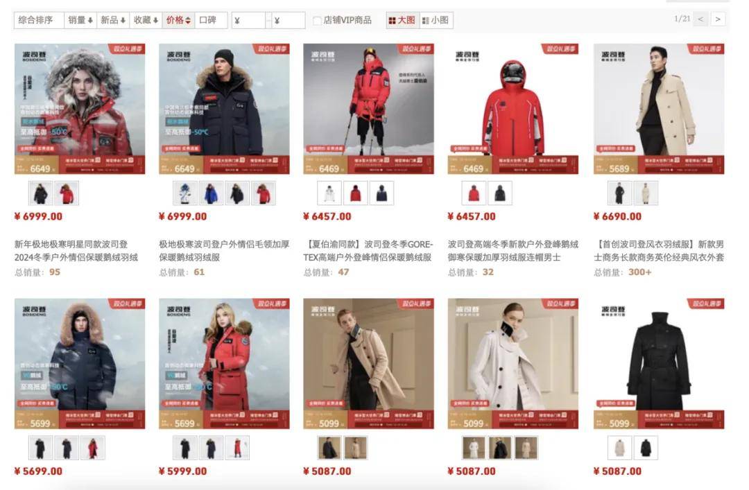在波司登官方旗舰店的销量排序中,销量最好的是999元的短款羽绒服、以及1299元的中长款羽绒服,总销量均超过7万件。在价格超过6000元的高端产品中,除了一款男士风衣羽绒服总销量达到300件,其余的均未超过百件。