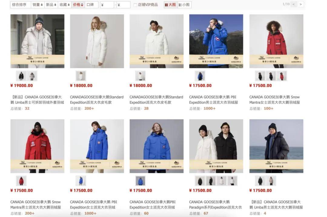对比加拿大鹅的天猫旗舰店,按价格排序,一款售价18000元的派克大衣总销量就超过200件,基础款17500元的女士派克羽绒服总销量超过1000件。Moncler天猫店尽管没有显示销量,但是售价14900元的一款男士Maya羽绒服的评价就超过了300个。