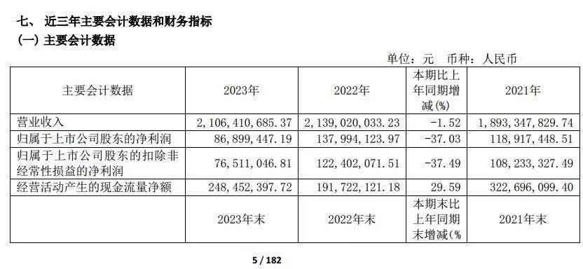 2023年,恒顺醋业实现营业收入21.06亿元,同比下降1.52%;净利润8689.94万元,同比下降37.03%。公司不仅再次出现业绩双降,而且净利润为2015年以来再次低于1亿元。