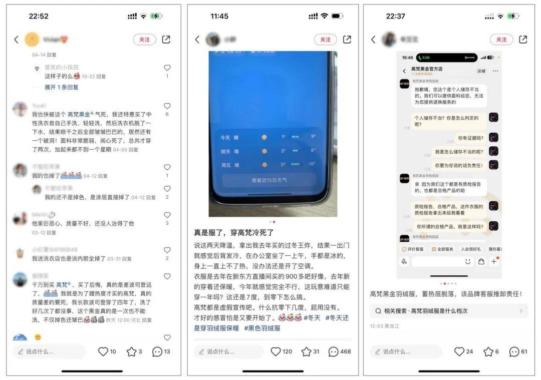 在小红书上,有关“高梵黑金”的“避雷笔记”很多,大量的笔记表示“高梵黑金”羽绒服存在跑绒、蓄热层脱落、开线、配件脱落等质量问题。“第一次洗,黄色的蓄热面料全部掉光了”“扣子没有锁边,到处跑绒”“将近2000买的衣服全是线头”。