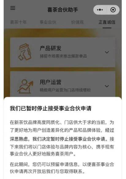 具体而言,2025年,喜茶会继续坚持“不做低价内卷”,不玩“数字游戏”;拒绝门店规模内卷,暂时停止接受事业合伙申请,携手并支持现有事业合伙人更好地服务用户;强化品牌与用户的深度连接,回归用户与品牌。